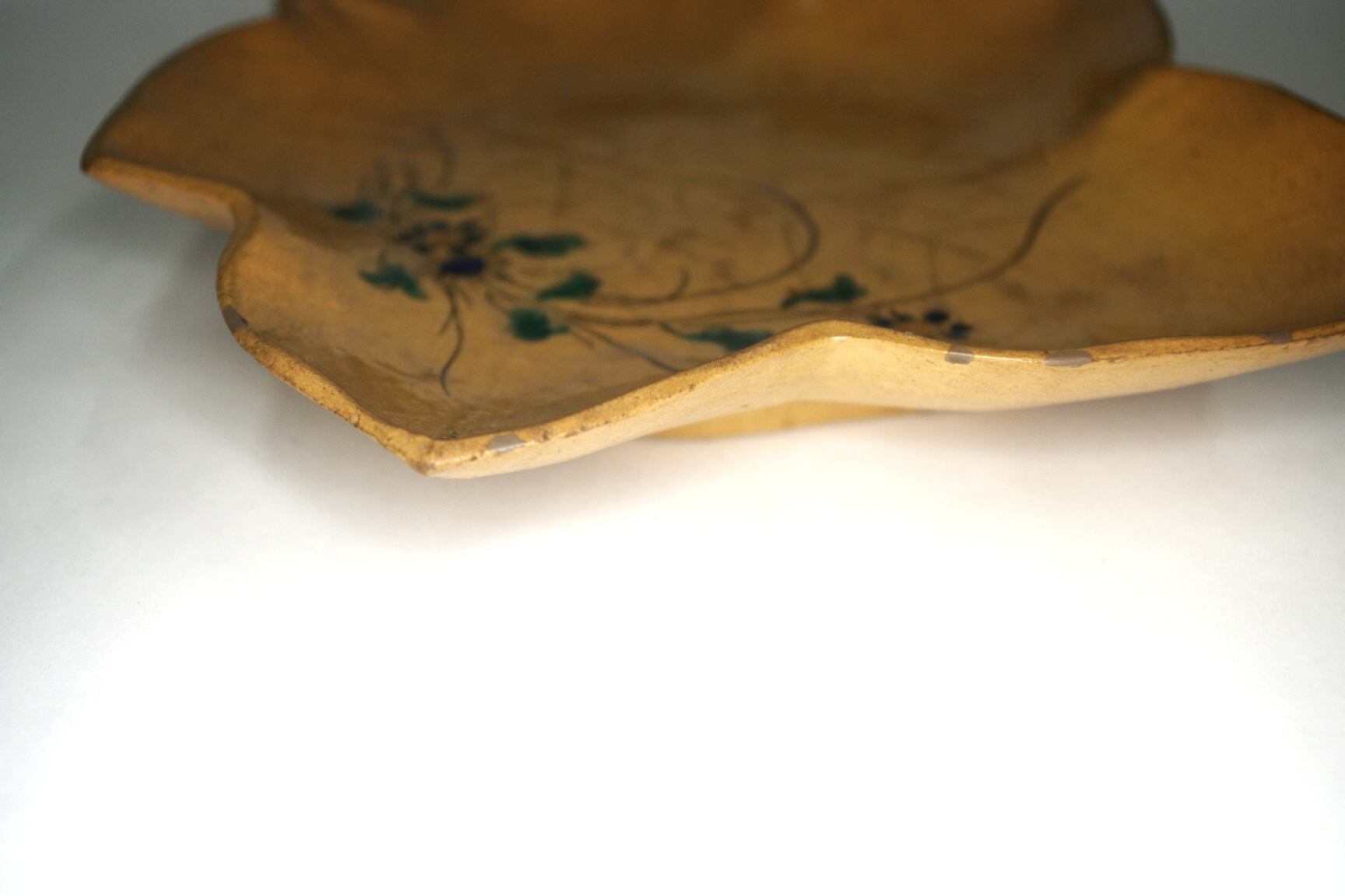 布志名焼 紅葉形草花図皿 傷多数 銀繕い14か所 他に釉剥げホツ有 箱無し